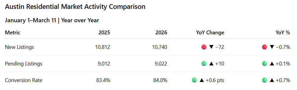 Austin residential (Jan 1–Mar 11): new listings are down 0.7% YoY, while pending contracts are now up slightly at +0.1% YoY. With supply slightly lower and demand holding steady, conversion is now up 0.7%, showing stronger buyer follow through relative to supply.